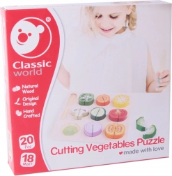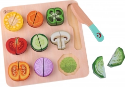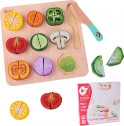 Acest set este un accesoriu perfect pentru jocul de rol încă de la o vârstă fragedă și aduce nu doar distracție, ci și valoare educativă. Conține 20 de elemente diferite, inclusiv un tăietor reversibil, un cuțit și legume. Jucăria este destinată copiilor de la 18 luni și este fabricată din lemn lăcuit, vopsită cu culori netoxice, ceea ce îi asigură siguranța completă.