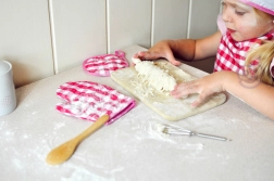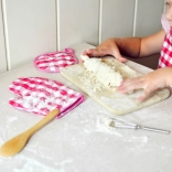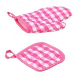Mănușile și suportul cu model gingham roz alb protejează micile mâini de suprafețele fierbinți, făcând gătitul sigur.