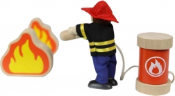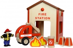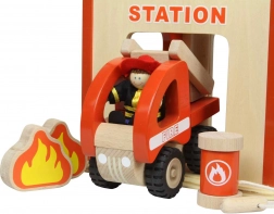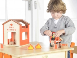 Această stație de pompieri miniatură este fabricată din lemn, ceea ce îi asigură durabilitatea și ecologicitatea. Include stația de pompieri, două figurine de pompieri, o mașină de pompieri și diverse accesorii precum flăcări, conuri și butoaie periculoase. Le permite copiilor să simuleze intervenții în situații de incendiu și le dezvoltă gândirea logică, abilitățile sociale și concentrarea.