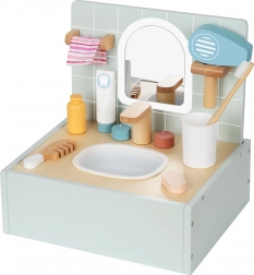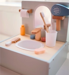 Transformați ritualurile zilnice de igienă în distracție creativă cu baia din lemn de la Tooky Toy. Acest set mini adorabil conține tot ce este necesar pentru scene de joacă cu baie, inclusiv oglindă, chiuvetă falsă cu robinet și accesorii realiste.