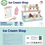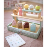 Suportul pe două niveluri, cornetele, înghețatele pe băț, lingurița și meniul invită la servire realistă și dezvoltă abilitățile sociale.