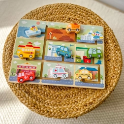 Copiii deplasează ambulanța, mașina de poliție, autobuzul sau barca pe trasee și le așază în scene tematice. Exersează gândirea logică și își îmbogățesc vocabularul despre mijloacele de transport.