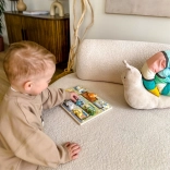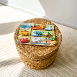 Placă din lemn durabilă, muchii netede și culori netoxice. Piesele voluminoase se prind ușor și susțin motricitatea fină și coordonarea mână–ochi.