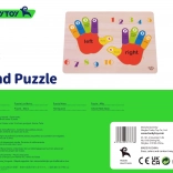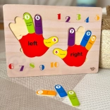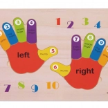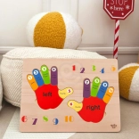 Acest puzzle din lemn de calitate îi ajută pe copii să-și însușească bazele matematicii și orientarea în spațiu. Două palme colorate, cu degetele detașabile, sunt clar marcate – dreapta/stânga, numerele degetelor și denumirile degetelor. Astfel, copiii conectează cu ușurință percepția vizuală cu numărarea și cu limbajul și pot exersa imediat pe propriile mâini.