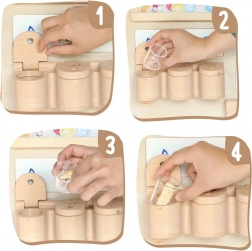 În partea de jos se află trei pahare din lemn cu tăvițe din plastic pentru ascunderea obiectelor și antrenarea recunoașterii mirosurilor. Copiii învață să distingă mirosuri puternice/slabe și plăcute/neplăcute, să sorteze obiectele în cele care miros și cele care nu miros, precum și cum să își protejeze simțul olfactiv. Panoul poate fi folosit într-un cadru de perete sau independent pe masă ori podea.
