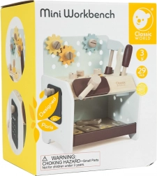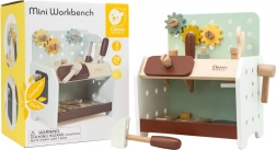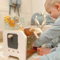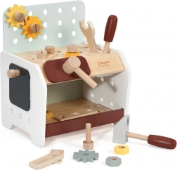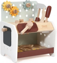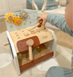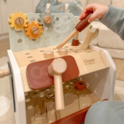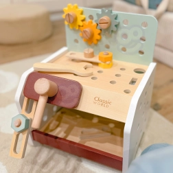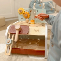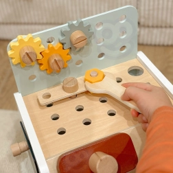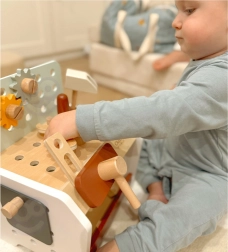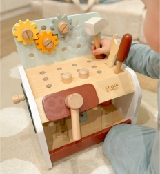Practic și ușor de transportat, bancul de lucru din lemn pentru copii oferă tot ce are nevoie micul meșter: ciocănel, șurubelniță, cheie, șuruburi, piulițe, roți dințate și plăcuțe cu orificii. Copiii pot găuri, înșuruba și bate cu ciocanul, își dezvoltă logica și învață principiile cauză–efect.