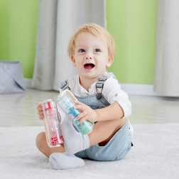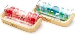 Biluțele colorate curg lin și creează un sunet delicat de ploaie, care îi fascinează și îi calmează pe copii.