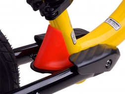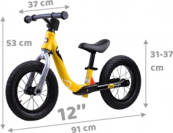 Pentru un control mai sigur, are limitator de rotație al ghidonului, gripuri antiderapante și protecție pentru cadru. Reglarea rapidă a șeii în intervalul de aproximativ 31–37 cm asigură setarea corectă a înălțimii. Roțile pneumatice de 12" cu spițe metalice oferă o plimbare confortabilă și o aderență bună pe diverse suprafețe.