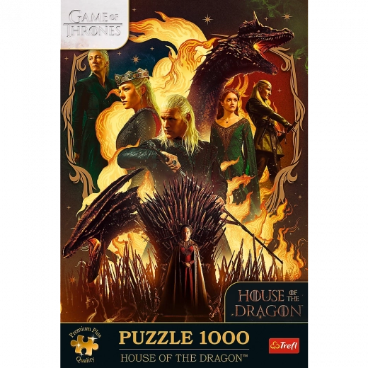 Descoperă puzzle-ul premium TREFL cu motivul Urzeala tronurilor: Casa Dragonului cu 1000 de piese. Seria Premium Plus oferă carton de înaltă calitate, prelucrare precisă, forme unice ale pieselor și certificare FSC pentru o producție responsabilă. Include model pentru asamblare mai ușoară, iar datorită rezistenței pieselor secțiunile finalizate pot fi mutate comod.