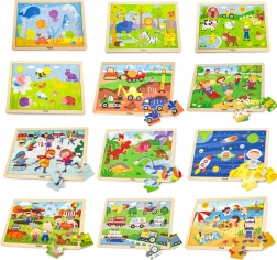 Setul de puzzle-uri din lemn Viga este alegerea ideală pentru primele exerciții de asamblare sistematică. Fiecare dintre cele 12 plăci include o ramă cu 24 de piese solide, care se potrivesc perfect și se țin bine în mâinile copiilor. Formele simple, desenele vesele și culorile vii susțin plăcerea jocului și dezvoltarea treptată a abilităților.
