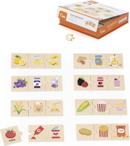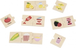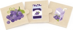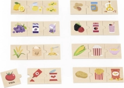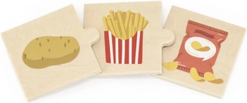 Acest set din lemn de calitate prezintă puzzle-uri simple care conectează materia primă cu produsul ei prelucrat. Copiii învață într-un mod distractiv de unde provin gustările lor preferate – de exemplu cartof și cartofi prăjiți, lămâie și limonadă, porumb și popcorn sau struguri și gem/suc de struguri.