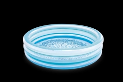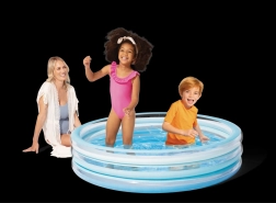 Piscina gonflabilă albastră pentru copii oferă o răcorire plăcută în zilele călduroase. Construcția stabilă din trei inele gonflabile asigură rezistență și margini moi, în timp ce pardoseala din PVC moale este plăcută la atingere și reduce alunecarea.