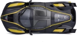 Datorită construcției metalice, modelul de mașinuță este robust și durabil, ceea ce îl face potrivit pentru a fi expus pe rafturile dumneavoastră pe termen lung sau ca un cadou minunat pentru pasionații de automobile. Pregătiți-vă să atrageți atenția cu acest model datorită vopselei sale negre și elementelor galbene caracteristice, care imită perfect o mașină de curse adevărată.