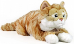 Pisica de pluș are detalii care imită fidel o pisică reală, inclusiv ochi albaștri și o culoare portocalie intensă.