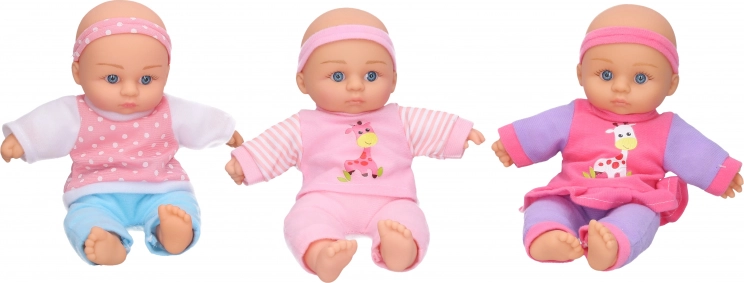 Bebeluș adorabil în hăinuțe pentru copiii de la 2 ani. Hăinuțe ușor de dat jos, trup moale, dimensiune 24 cm.