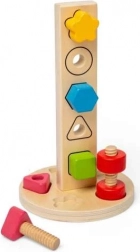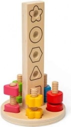Înșurubarea și înșiruirea formelor pe țăruș întăresc degetele, încheietura și coordonarea mână–ochi. Ideal pentru primele abilități motorii.