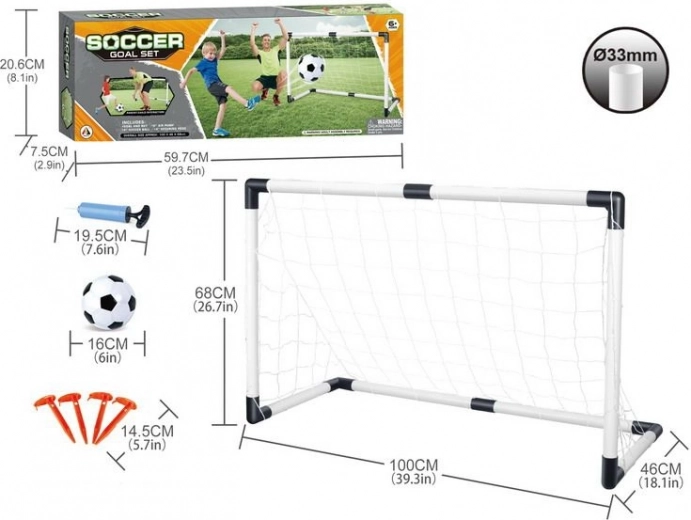Set de fotbal pentru jucători mici și mari, care include o poartă pliabilă și o minge. Un accesoriu grozav pentru toți fanii fotbalului, ideal pentru joacă în grădină sau în parc.
