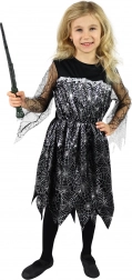 Acest costum de vrăjitoare este alegerea ideală pentru micile domnișoare cu vârsta între 4-6 ani (înălțime 105-116 cm). Costumul este compus dintr-o rochie neagră cu model de pânză argintie, oferind un aspect misterios și magic. Este proiectat pentru a fi confortabil de purtat și permite mișcarea liberă.