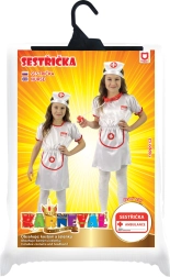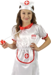 Un costum de carnaval drăguț pentru micile asistente medicale, perfect pentru toate fetițele care adoră jocurile de-a doctorul. Mărimea M este potrivită pentru copii de 6–8 ani (117–128 cm). Setul include rochiță și bonetă; stetoscopul nu este inclus în pachet.