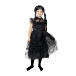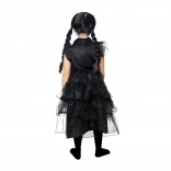Transformați micuța vedetă a petrecerii într-o doamnă misterioasă. Rochia neagră, cu straturi și volane fine, împreună cu centura decorativă, creează un look gotic elegant, care se remarcă la orice petrecere, carnaval sau serbare mascată la școală.