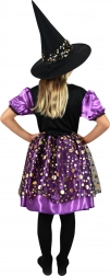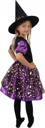 Oferiți micii vrăjitoare o ținută în care va străluci la orice petrecere. Rochia mov‑negru, cu buline aurii, mânecuțe bufante și fustă de efect, creează un look fermecător care atrage privirile. Include și o pălărie asortată, astfel încât costumul este complet și gata de purtat imediat.