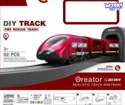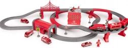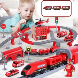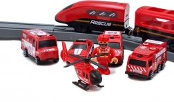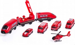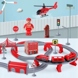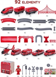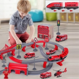 Pachetul include locomotivă (2× AAA, neincluse), 2 vagoane, 4 vehicule de pompieri, elicopter, figurină pompier, depou, pod, tunel, șine, suporți și semnalizare rutieră. Combinația dintre calea ferată și tehnica rutieră de salvare susține coordonarea mână-ochi, orientarea în spațiu și jocul narativ.