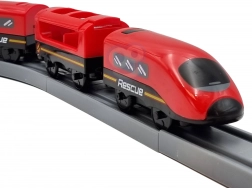 Locomotiva modernă pe baterii (2× AAA, neincluse) rulează pe un traseu bogat echipat, cu pod și tunel, pentru o experiență și mai realistă.