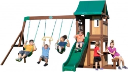 Locul de joacă de exterior compact BACKYARD DISCOVERY Lakewood aduce copiilor distracție nesfârșită chiar și în grădinile mai mici. Oferă două leagăne, trapez pentru micii acrobați, platformă de joacă înălțată cu copertină colorată, ușă și fereastră reale cu băncuță și, mai ales, un tobogan rapid de 244 cm. Construcția durabilă din cedru și detaliile gândite cu atenție asigură joaca în siguranță pentru copiii de la 3 ani.