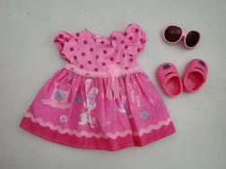 - rochie roz cu imprimeu cu iepuraș, pantofiori, ochelari de soare