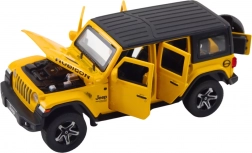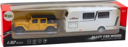 Model metalic realist de mașină de teren cu rulotă la scara 1:32, cu construcție metalică, efecte de lumină și sunet, mecanism pull-back și uși care se deschid. Perfect atât pentru joacă, cât și pentru colecție, include baterii.