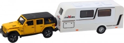 - mașină de teren galbenă, rulotă albă
