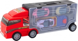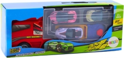 Camion mare și trei mașinuțe sport în culori vii – cadoul ideal pentru copii de la 3 ani.