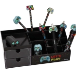 Partea superioară compartimentată găzduiește creioane, markere, foarfece și accesorii mai mici. Fiecare obiect are locul său, iar biroul rămâne curat.