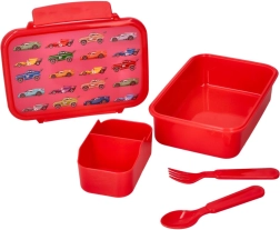 Căutați o cutie de gustare compactă și rezistentă pentru copii și adulți? Această caserolă pentru prânz, cu un motiv vesel cu mașinuțe, păstrează mâncarea proaspătă și bine închisă. Include un set practic de tacâmuri, astfel încât aveți totul la îndemână oriunde v-ați afla.