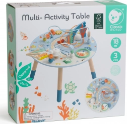 Măsuță din lemn pentru activități de la brandul Classic World este o jucărie ideală pentru copiii curioși! Plină de atracții colorate, precum cinci activități motrice, rotițe dințate, xilofon sau tamburină, aduce multă bucurie și ajută în același timp la dezvoltarea unor abilități importante, precum dexteritatea manuală, gândirea logică și îndemânarea.