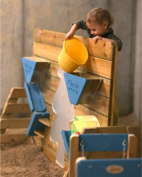 - Joacă senzorială versatilă: apă și nisip, pâlnii, jgheaburi și moară.