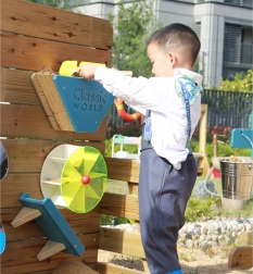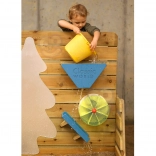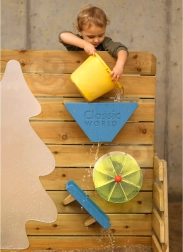 Acest joc din lemn dezvoltă motricitatea fină, gândirea logică și creativitatea. Copiii pot turna nisip sau apă în pâlnii, pot urmări cum curentul pune în mișcare roata și se scurge pe jgheaburi, descoperind principiile cauzei și efectului. În centru se remarcă o folie oglindă în formă de copac, care stimulează percepția senzorială.
