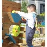 Structura este realizată din lemn de pin impregnat, rezistent la intemperii și tratat în siguranță cu vopsea netoxică. Partea din spate a panoului include o bancă practică și un raft inferior pentru depozitarea jucăriilor – ideal pentru o scurtă pauză între sesiuni de joacă.
