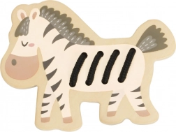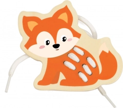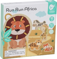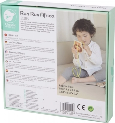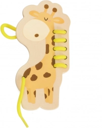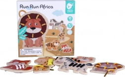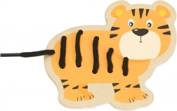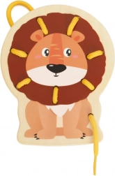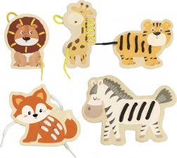 Setul conține 5 animale africane (girafă, leu, tigru, vulpe și zebră) și 5 șireturi colorate. Piesele din lemn netede, cu un finisaj sigur, se potrivesc bine în mâinile copiilor, iar culorile vii susțin recunoașterea culorilor și denumirea animalelor.
