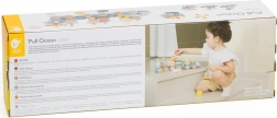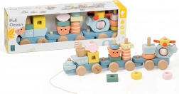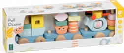 Trenulețul de tras din lemn Ocean de la CLASSIC WORLD, în culori pastelate, îmbină distracția cu învățarea – dezvoltă motricitatea fină, coordonarea și imaginația. Copiii asamblează forme cu tematică oceanică, conectează trei vagoane și, datorită șnurului, pot trage trenulețul atât în timpul târâtului, cât și al mersului.