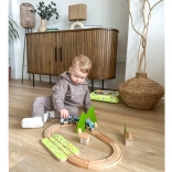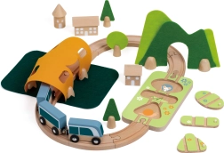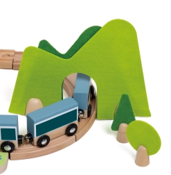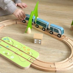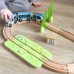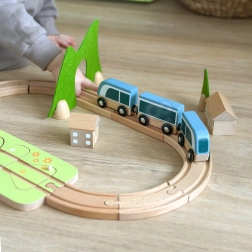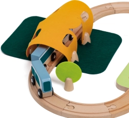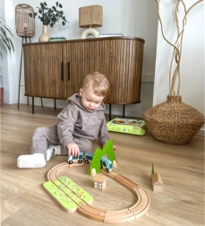 Piesele pot fi combinate creativ – blocurile de lemn se pot suprapune pentru a crea căsuțe în jurul șinelor. Materialele naturale de calitate (lemn certificat FSC, fetru din P.E.T. reciclat) sunt durabile, plăcute la atingere și prietenoase cu mediul. Ideal pentru joacă independentă sau pentru descoperiri în familie.