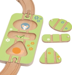 Puzzle-ul cu forme se conectează la șine; copiii caută piesele potrivite după animăluțe și flori și își exersează logica și răbdarea.