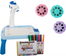 Setul include 3 discuri tematice (dinozauri, personaje, eroi) – în total 24 de imagini pentru trasare, 12 markere, un burete de șters și o cărticică de desen. Proiectorul are cap reglabil și braț rotativ, astfel încât puteți seta ușor unghiul corect de proiecție pe hârtie sau pe tablă. Compartimentele pentru markere și discuri păstrează totul la îndemână.
