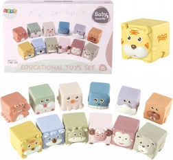Acest set de 12 cuburi moi este conceput pentru joaca sigură și stimulativă a celor mai mici copii. Fiecare cub prezintă un alt animăluț și oferă o structură de suprafață distinctă, care aduce stimuli tactili bogați. Copiii își dezvoltă în mod natural coordonarea mână–ochi, învață să recunoască forme, culori și denumiri de animale și își exersează în același timp prinderea.
