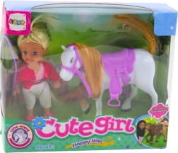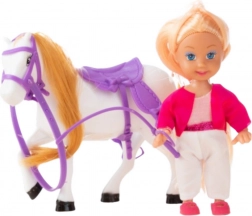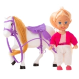 Conținutul pachetului: mini păpușă în ținută de călărie, cal alb cu coamă și coadă lungă, șa și frâu mov, bici de călărie.