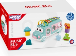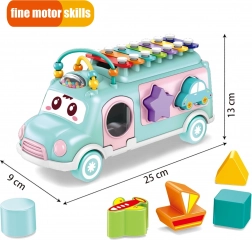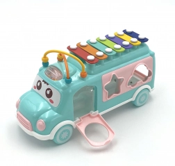 Mașinuța muzicală are multe elemente de manipulare și descoperire. Copilul poate folosi ciocanul inclus pentru a cânta pe xilofonul colorat amplasat pe acoperișul vehiculului. Pe lateralele mașinuței sunt deschideri de diferite forme, împreună cu cuburi colorate care pot fi introduse în aceste deschideri. Acest joc ajută copilul să dezvolte abilitățile de coordonare și recunoașterea culorilor și formelor. Perlele de pe acoperiș, pe care copilul le poate muta, îi exersează dexteritatea și concentrarea.