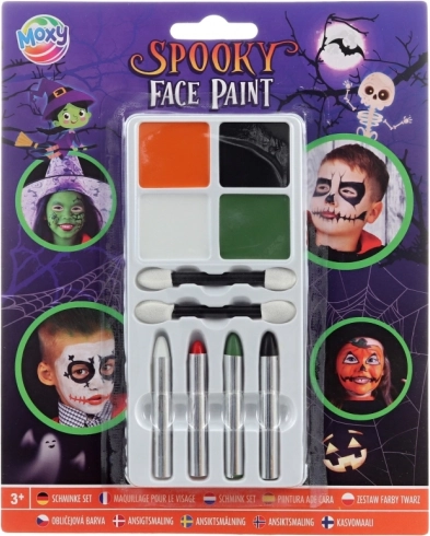 Setul MOXY pentru pictură pe față, Halloween înfricoșător: 4 culori, 4 creioane, 2 aplicatoare. Aplicare și demachiere ușoare. Ideal pentru carnaval și petreceri.
