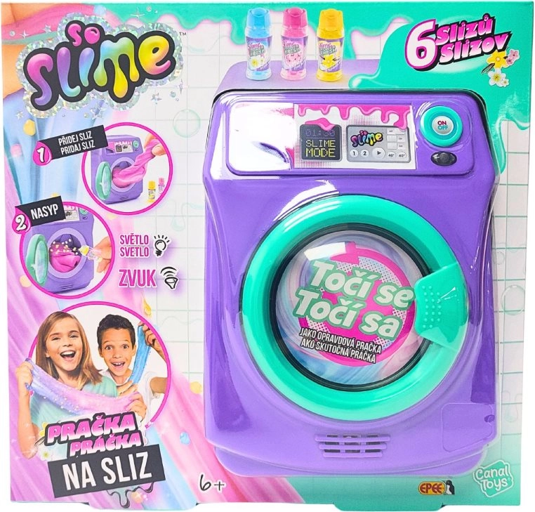 Descoperă creația distractivă de slime cu jucăria SO SLIME mașină de spălat parfumată în culori mov-turcoaz. Copiii de la 6 ani se vor bucura de efecte luminoase și sonore, tambur rotativ și ușiță transparentă pentru a urmări amestecarea. În pachet găsești 6 plicuri cu slime, coș, sticluță și 3 perle parfumate pentru un slime magic, parfumat și colorat. Alimentare cu 3× AA (nu sunt incluse).