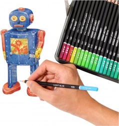 Fiecare nuanță este numerotată pentru a găsi rapid culoarea potrivită în timpul lucrului. Corpurile din lemn de tei se ascut ușor și reduc riscul de rupere. Carcasa metalică protejează setul în călătorii și la depozitarea acasă și este un cadou ideal pentru spiritele creative.