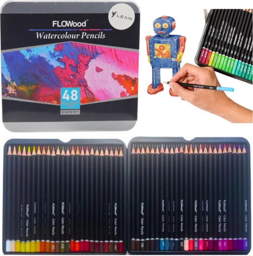 Set profesional cu 48 de creioane acuarelă pentru începători și artiști avansați. Oferă pigmentație intensă, trasare moale, amestecare fluidă a culorilor și ștergeri/estompări ușoare. Fiecare creion are marcaj de nuanță pentru orientare rapidă și este realizat din lemn de tei de calitate pentru ascuțire ușoară și rezistență la rupere. Carcasa metalică elegantă protejează setul și ușurează transportul.